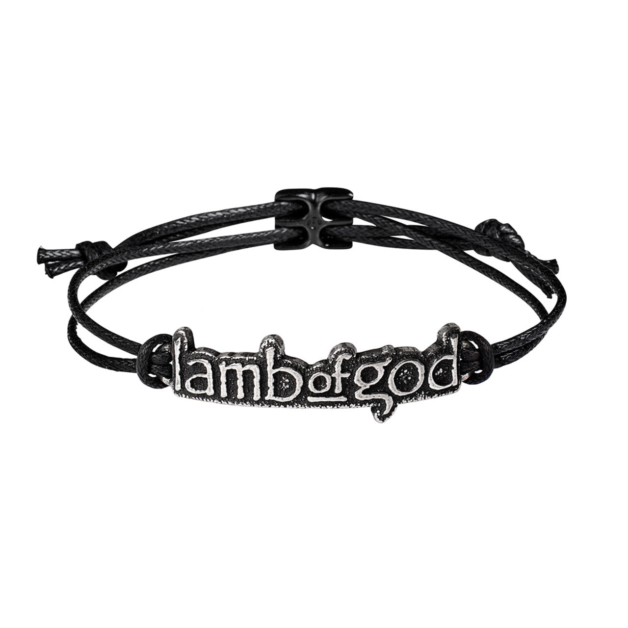 Lamb of God Wrist Strap Bracelet by Alchemy Gothic. Licensed and fully authorized Lamb of God Bracelet, featuring the classic Lamb of God text logo design in 3D sculpted pewter. Comes on a doubled black waxed cord with a black pewter slide fastener allowing adjustability up to 10" (25cm) in diameter. Designed and handmade exclusively by Alchemy Gothic, made of lead-free fine English pewter.